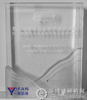 2013年4月25日,"第八屆中小企業(yè)電子商務(wù)大會"在寧波市南苑飯店隆重召開,本屆大會的主題是"中小企業(yè)電商逆襲"。經(jīng)過專家、評委選舉,專業(yè)破碎機品牌鄭州一帆機械設(shè)備有限公司最終榮獲“2012年度中小企業(yè)電子商務(wù)應(yīng)用10強”,彰顯了一帆公司在電子商務(wù)領(lǐng)域的地位。