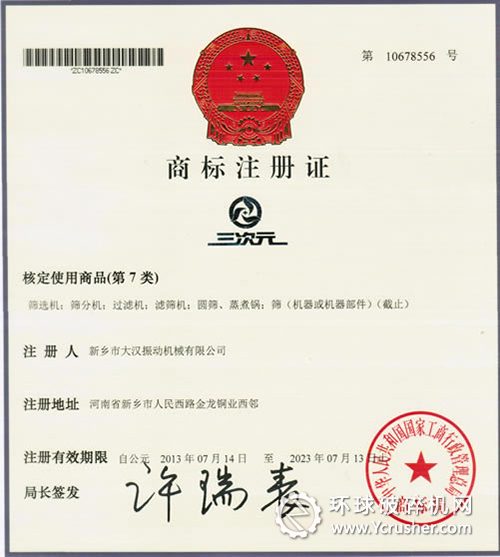 新鄉市大漢振動機械有限公司專業的振動篩分設備制造商正式獲得“三次元”商標注冊證書。據悉此次“三次元”商標核定商品屬于第7類,主要用于篩選機;篩分機;過濾機;圓篩、篩(機器或機器部件)等產品,即輕型振動篩選機類商標使用范疇。