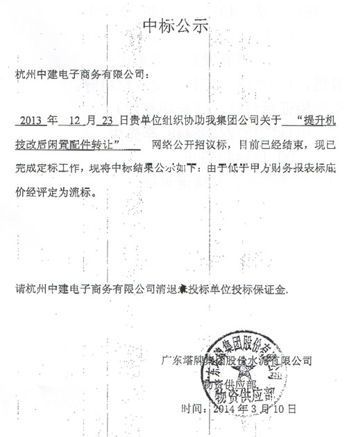 日前,塔牌集團(tuán)委托中國水泥備件網(wǎng)代理該公司“提升機(jī)技改后閑置配件轉(zhuǎn)讓”網(wǎng)絡(luò)公開招議標(biāo),目前由于低于甲方財(cái)務(wù)報(bào)表標(biāo)底價(jià)經(jīng)評定為流標(biāo)。