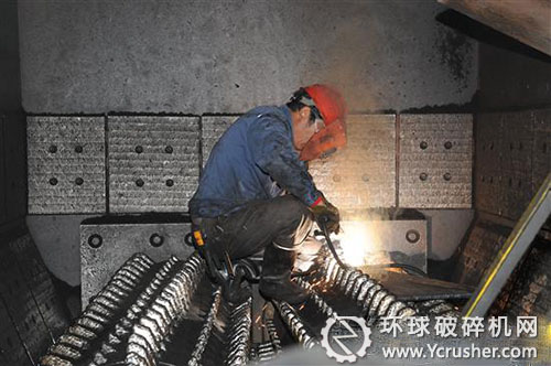 圖為公司職工正在維修破碎機滾齒。