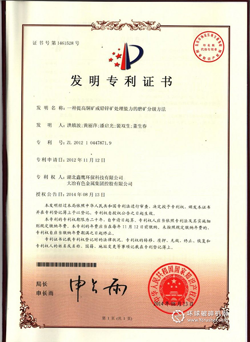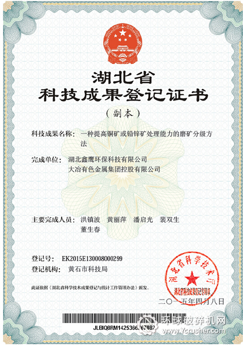 技術(shù)創(chuàng)新促進企業(yè)發(fā)展。2015年4月8日,鑫鷹科技一種提高銅礦或鉛鋅礦處理能力的磨礦分級方法,榮獲湖北省科學技術(shù)成果登記證書,在公司的榮譽墻上又增添了新的一筆。