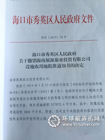 2014年5月23日,海口市秀英區(qū)人民政府批準(zhǔn)同意展源公司關(guān)于“展源現(xiàn)代農(nóng)業(yè)旅游科普示范園”項(xiàng)目《設(shè)施農(nóng)用地批準(zhǔn)通知書(shū)》。此外,展源公司為了盡早開(kāi)工,還向多部門(mén)報(bào)批。如:灌木雜草的采伐已報(bào)海口市林業(yè)局批準(zhǔn),海口市規(guī)劃局秀英分局對(duì)項(xiàng)目建設(shè)作出指導(dǎo)意見(jiàn)。因項(xiàng)目用地地質(zhì)情況特殊,根據(jù)項(xiàng)目建設(shè)報(bào)建的“展源石料生產(chǎn)加工場(chǎng)”用地申請(qǐng)已得到海口市秀英區(qū)長(zhǎng)流鎮(zhèn)人民政府的同意,而“展源石料生產(chǎn)加工場(chǎng)”生產(chǎn)線(xiàn)也同時(shí)報(bào)海口市環(huán)保局批準(zhǔn)。