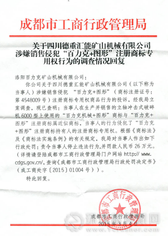 2015年 5月 13日,成都市工商行政管理局發(fā)布關(guān)于洛陽(yáng)百力克礦山機(jī)械公司立軸沖擊式破碎機(jī)(百力克機(jī)械+圖形)注冊(cè)商標(biāo)專用權(quán)被四川德重匯能礦山機(jī)械公司侵權(quán)投訴結(jié)果公布,管理局于2015年2月2日對(duì)四川德重匯能礦山機(jī)械有限公司(以下簡(jiǎn)稱:當(dāng)事人)作出《行政處罰決定書(shū)》(成工商處〔2015〕01004號(hào)),決定對(duì)當(dāng)事人罰款26萬(wàn)元(貳拾陸萬(wàn)元)。當(dāng)事人在法定期限內(nèi)對(duì)該行政處罰決定未申請(qǐng)行政復(fù)議或者提起行政訴訟,也未履行該行政處罰決定,依據(jù)《中華人民共和國(guó)行政強(qiáng)制法》第五十四條的規(guī)定,本局現(xiàn)催告當(dāng)事人自本公告之日起十日內(nèi),履行上述行政處罰決定。