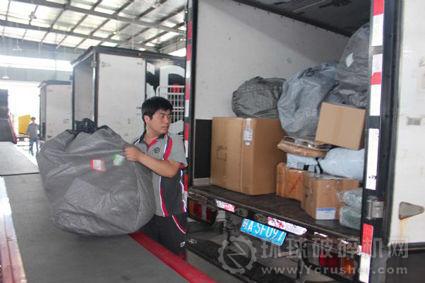 圖為:一名快遞員正將皮帶機(jī)上輸送過(guò)來(lái)的快遞包裹裝車,沒(méi)有皮帶輸送機(jī)前,這項(xiàng)工作至少需要兩人合力,多花一倍甚至更多的時(shí)間才能完成