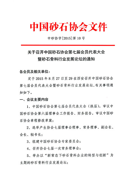 關于召開中國砂石協(xié)會第七屆會員代表大會暨砂石骨料行業(yè)發(fā)展論壇的通知: