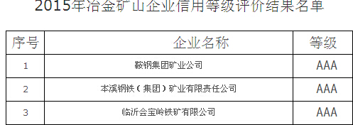 2015年冶金礦山企業(yè)信用等級評價結(jié)果名單: