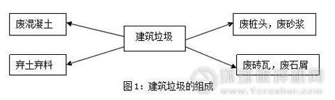 建筑垃圾主要是由事業(yè)單位和居民個人這兩大主體制造的,其中90%來自于建筑單位和施工單位在新建、改建、擴(kuò)建和拆除建筑物、構(gòu)筑物、管網(wǎng)等產(chǎn)生,而居民個人在裝修和裝飾房子的過程中產(chǎn)生的棄土、棄料和其他垃圾所占的比重較少。從來源我們可以知道,建筑垃圾主要是對建筑作業(yè)的過程中產(chǎn)生的,主要包括廢棄的磚瓦,砌塊、砂漿、混凝土、樁頭以及包裝材料,如圖1所示。