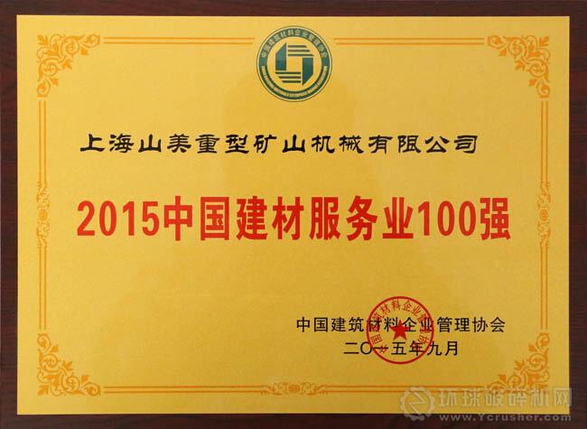 2015年9月中旬,在由中國建筑材料企業(yè)管理協(xié)會組織召開的“2015中國建材企業(yè)發(fā)展論壇暨2015中國建材企業(yè)500強、建材服務(wù)業(yè)100強、民營建材企業(yè)100強、最具成長性建材企業(yè)100強發(fā)布會”上,上海山美獲2015中國建材服務(wù)業(yè)100強,裝備供應(yīng)商全國十強殊榮。