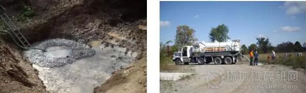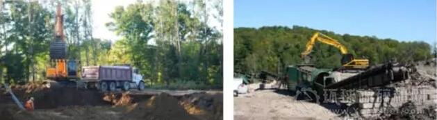 利用挖掘機(jī)將填埋土壤和垃圾送至卡車(chē),轉(zhuǎn)運(yùn)至另一運(yùn)行填埋場(chǎng)進(jìn)行篩分,之后再重新填埋;