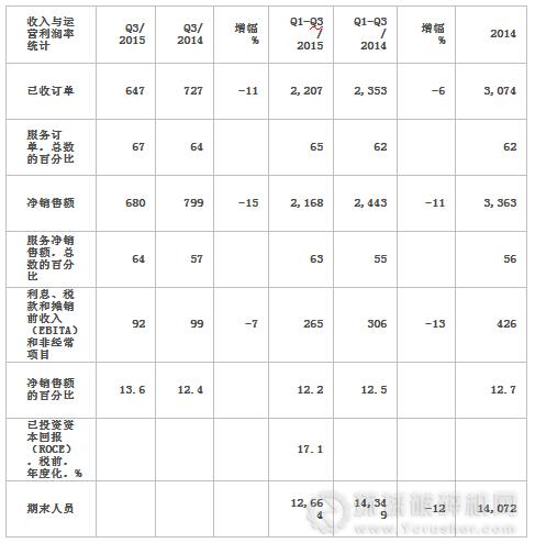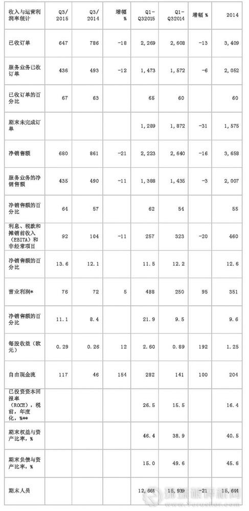 除另有說明,括號中的數據為2014年同期值。美卓已于2015年4月1日拆分過程自動化系統(PAS)業務,其未被計入7-9月的流體控制業務。2015年1-9月及其所有對比時間若早于拆分日的,則該數據包括PAS業務。其他相同經營業務下的對比數據已單獨說明。