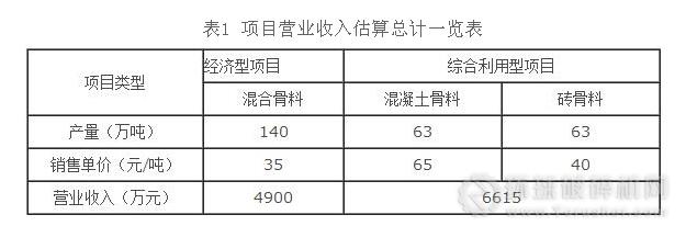 建議在磚與砼比例相當(dāng)?shù)那闆r下采用磚與砼分離建筑垃圾加工工藝,所以,進(jìn)行加工項(xiàng)目的營業(yè)收入計(jì)算時(shí)擬定磚塊、混凝土塊所占比例相當(dāng)。