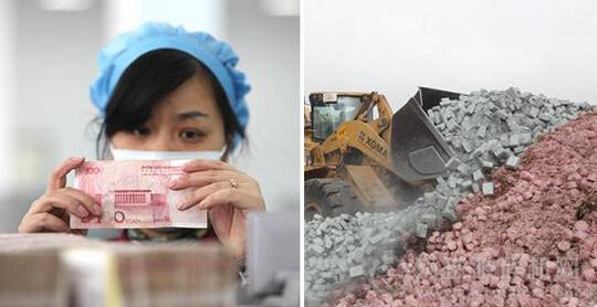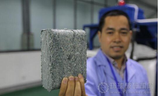 在南京鈔票處理中心銷毀車間,經過復點抽查完畢的殘損人民幣由大型銷毀設備進行粉碎性銷毀。圖為殘鈔壓塊。