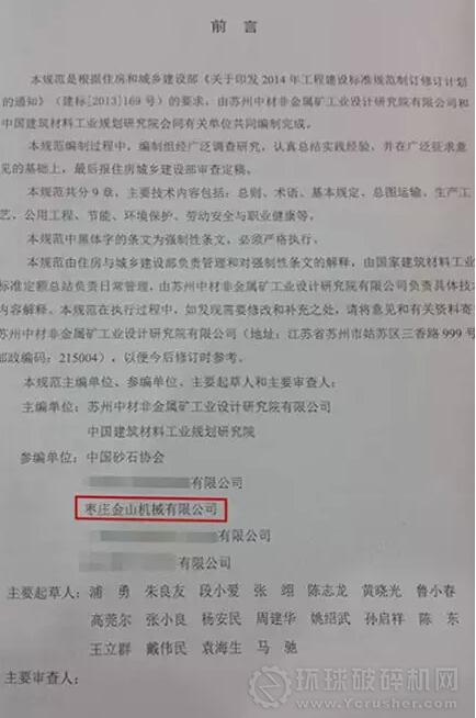 制砂生產線不符合國家環保標準。一直以來,砂石行業都沒有制定標準來規范行業行為。隨著我國砂石骨料行業的發展壯大,編制標準對規范行業行為,促進行業健康發展具有非常重要的意義。棗莊市金山機械有限公司受邀參與此次審定,是砂石骨料行業對金山機械的認可。金山機械研制出了高效節能型
