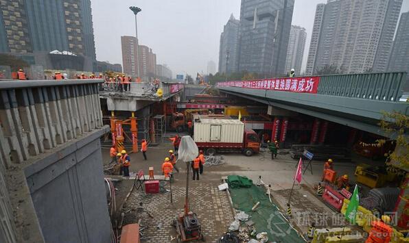 預(yù)計,14日凌晨3點(diǎn)多,切割剩下的橋面由馱梁車分兩次,從原橋墩平移至臨時橋墩上。之前,長55米寬45米重達(dá)1300噸的新橋面已焊接完畢,停放在臨時橋墩上。5點(diǎn)多,開始從臨時橋墩至原橋墩馱運(yùn)新橋面,預(yù)計在今日8點(diǎn)20分,新橋面能完全就位。開始澆筑混凝土實(shí)現(xiàn)橋面與現(xiàn)有路段的連接。