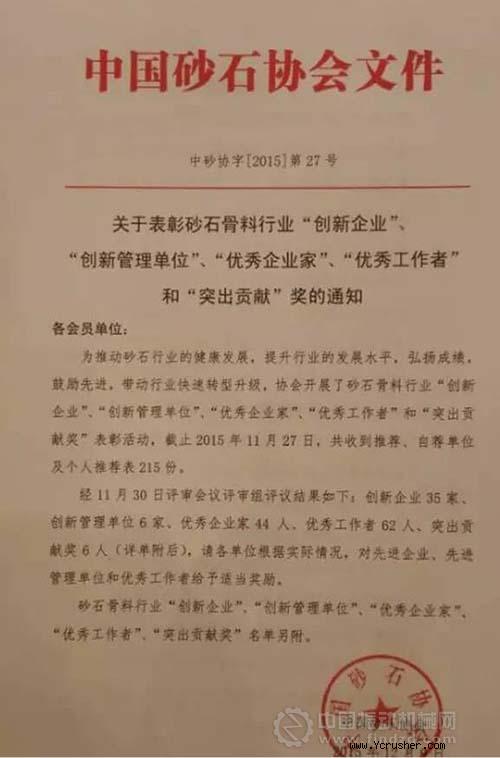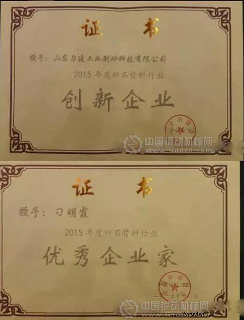 熱烈祝賀山東力建工業制砂科技有限公司榮獲“2015砂石骨料行業創新企業”!公司董事長刁明霞榮獲“優秀企業家”稱號!!!