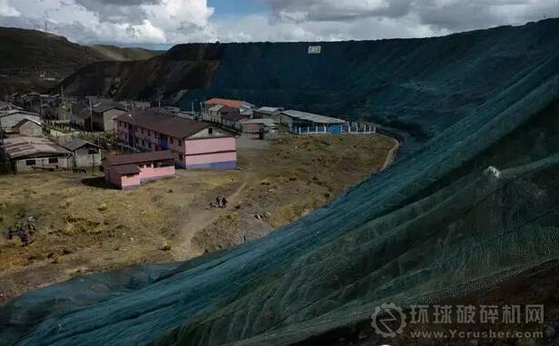 Champamarca街區(qū)附近罩在尾礦堆上的綠色網(wǎng)罩是用來(lái)減少被風(fēng)吹拂到街上和人們家中的有毒塵埃的。