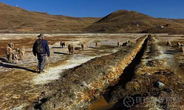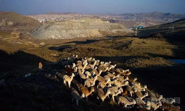 70歲的Martin Trinidad Saco領(lǐng)著他的羊穿過(guò)塞羅德帕斯科附近一條干涸的瀉湖受到高度污染的河床。Trinidad Saco還記得以前這條瀉湖還能為動(dòng)物提供水源的時(shí)候,人們?cè)谶@里捕魚、收集鳥蛋時(shí)的情形。