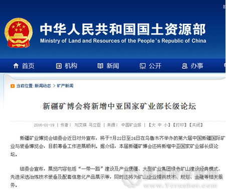 1月19日,國土資源部刊登新聞《新疆礦博會將新增中亞國家礦業(yè)部長級論壇》。新疆維吾爾自治區(qū)人民政府主辦的新疆礦業(yè)博覽會將于2016年增加中亞國家礦業(yè)部長級論壇,即“中國-亞歐礦業(yè)部長級論壇”。