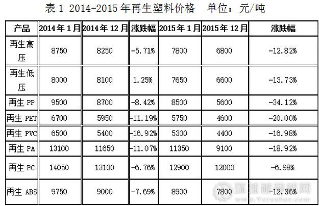 從表1可見,2015年再生塑料產(chǎn)品全面下行,其中再生PP、再生PET跌幅在20%以上。主要因?yàn)椋腕E降后在2015年一直維持低位震蕩,且再生PP、再生PET下游注塑、拉絲、化纖行業(yè)作為傳統(tǒng)制造業(yè)庫(kù)存壓力較大,且屬于勞動(dòng)密集型低附加值行業(yè),整體利潤(rùn)狹窄,下游需求尤為清淡。在新料節(jié)節(jié)大幅跳水后,回料價(jià)格優(yōu)勢(shì)不復(fù)存在,導(dǎo)致此類產(chǎn)品價(jià)格面臨暴跌行情。就再生PP而言,今年下降2900元/噸,年度跌幅高達(dá)34.12%,截至目前業(yè)者處于虧損狀態(tài),整體開工率也較往年低1-2成。其他產(chǎn)品,如再生PE高低壓、再生PC、再生ABS等下游分布較廣,可用于注塑、拉絲、吹膜、吹塑等,風(fēng)險(xiǎn)趨于分散,價(jià)格相對(duì)承壓,因此本年度跌幅相對(duì)處于中低水平。就再生PE高壓而言,今年下降1000元/噸,降幅在12.82%,而新料卻走低2000-3000元/噸,屬于抗跌產(chǎn)品。