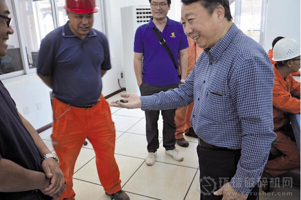 冀東發(fā)展集團(tuán)副總經(jīng)理陳鷹接過(guò)曼巴項(xiàng)目生產(chǎn)的第一顆熟料