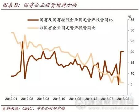 而基建項目增長對國有企業(yè)投資拉動更大,1~2月份,國有及國有控股企業(yè)固定資產(chǎn)投資同比增長20.2%,遠(yuǎn)高于非國有企業(yè)5.7%的增速(圖表8).