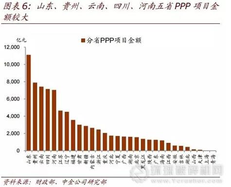 從地域看,ppp項目發(fā)起金額最大的是山東,一些西部省份也比較積極。山東、貴州、云南、四川和河南五省項目金額約占總投資額一半。財政狀況較好的深圳市沒有發(fā)起ppp項目,上海市只發(fā)起了一個ppp項目,青海省也只有1個ppp項目。(圖表6)