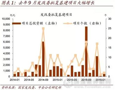 發(fā)改委去年9月加快基建項目審批,2015年以來批復(fù)了100多個交通運(yùn)輸和城市軌道交通項目或建設(shè)規(guī)劃,總投資額2萬多億元。2015年9月,發(fā)改委聯(lián)合國開行、農(nóng)發(fā)行召開會議,推進(jìn)“促投資穩(wěn)增長”的十大舉措,9月當(dāng)月批復(fù)了18個項目,投資額8680億元(圖表1).