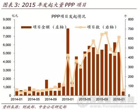 此外,2015年地方政府發(fā)起大量ppp項目。截至2月底,財政部政府和社會資本合作中心ppp項目庫收錄了7110個項目,總投資額8.3萬億元。其中6000個項目是2015年之后發(fā)起,總投資額6.8萬億元。(圖表3)