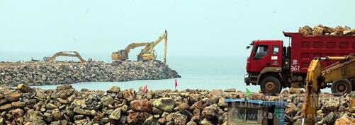 建設(shè)現(xiàn)場(chǎng),數(shù)十輛泥頭車排成長(zhǎng)龍,陸續(xù)拋填石料入海,用以延長(zhǎng)、拓寬配套碼頭