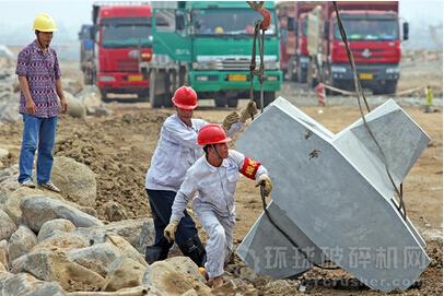 工作人員將巨大的混凝土防浪塊吊裝入堤
