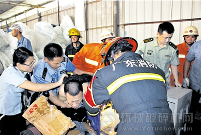 破碎機,里面的溫度最高可達160攝氏度,人站在機器旁邊都能感受到熱力。根據(jù)現(xiàn)場情況,消防員立即疏散無關人員,并讓公司管理人員找來兩臺大風扇降溫,同時與男子對話,分散其注意力。消防隊員向公司管理人員了解機器的工作原理和構造之后,通過反方向推動機器轉(zhuǎn)軸的方式,慢慢地將男子的左手從機器內(nèi)拿出。5分鐘左右,男子的手從機器內(nèi)完全取出,但由于他的手卷進機器后被壓迫