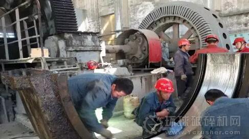 圖為檢修人員對為大型設(shè)備φ5500×1800自磨機(jī)軸瓦進(jìn)行刮研、清洗和安裝工作。