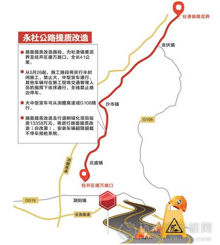 為了確保工程進度和施工期間的道路交通安全,從5月26起,施工路段將實行半封閉施工,禁止大、中型貨車通行,其他車輛可在施工現(xiàn)場交通管理人員的指揮下依序通行,全線禁止路邊停車。大中型貨車可從瀏醴高速或G106繞行。“作為2016年全市重點項目,永社公路提質(zhì)改造承載著北區(qū)30萬人的期盼。”市公路局局長陳建政表示,市公路局將按照荷文公路的建設(shè)標(biāo)準(zhǔn),結(jié)合永社公路實際情況打造旅游精品線路。