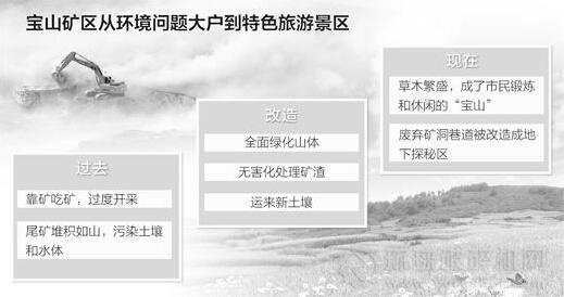2010年開(kāi)始,桂陽(yáng)縣投入4000多萬(wàn)元對(duì)山體進(jìn)行全面綠化,投入1000多萬(wàn)元對(duì)寶山周邊道路進(jìn)行提質(zhì)改造。堆積成山的礦渣或被運(yùn)走或被深埋,進(jìn)行無(wú)害化處理,而新的土壤也被運(yùn)來(lái)覆蓋在山體表面。歷經(jīng)多年“梳妝打扮”,如今,寶山之上草木繁盛、郁郁蔥蔥,成了市民鍛煉和休閑的“寶山”。