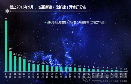 接下來(lái),我們具體看城鎮(zhèn)污水在建規(guī)模的分布。從下圖可以看出,“上海”可謂一支獨(dú)秀,達(dá)到95萬(wàn)噸/日的規(guī)模,其次是湖南(37.7萬(wàn)噸/日)、重慶(28.5萬(wàn)噸/日)!
