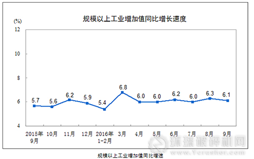 2016年9月份,規(guī)模以上工業(yè)增加值同比實(shí)際增長(zhǎng)6.1%(下同,增加值增速均為扣除價(jià)格因素的實(shí)際增長(zhǎng)率),較8月份回落0.2個(gè)百分點(diǎn)。從環(huán)比看,9月份,規(guī)模以上工業(yè)增加值比上月增長(zhǎng)0.47%。1-9月份,規(guī)模以上工業(yè)增加值同比增長(zhǎng)6.0%。