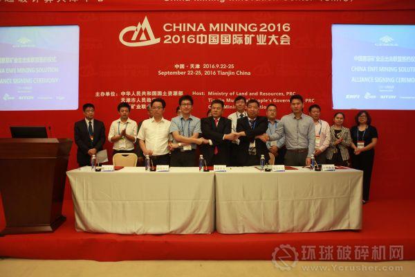 中國恩菲礦業(yè)“走出去”聯(lián)盟簽約儀式也在天津梅江會展中心同期隆重舉行。中國恩菲總經(jīng)理伍紹輝,海王科技集團副董事長孫吉鵬,南昌礦山機械有限公司董事長李順山,江西鑫通機械制造有限公司副總經(jīng)理楊鑫,贛州金環(huán)磁選設(shè)備有限公司總經(jīng)理李澤萍代表聯(lián)盟首批成員簽約。