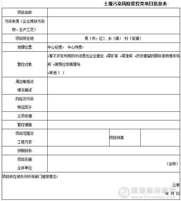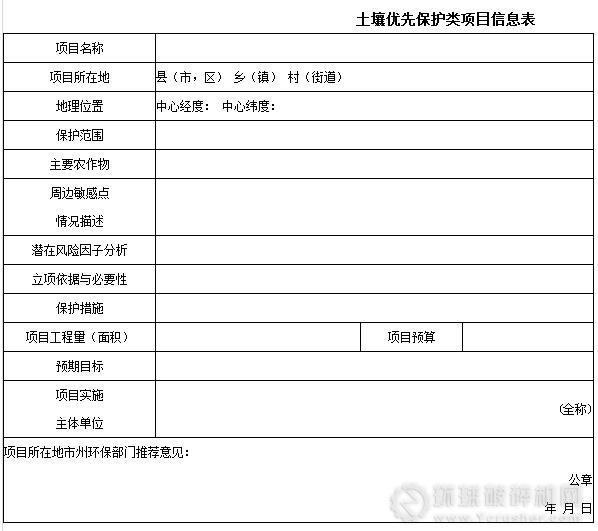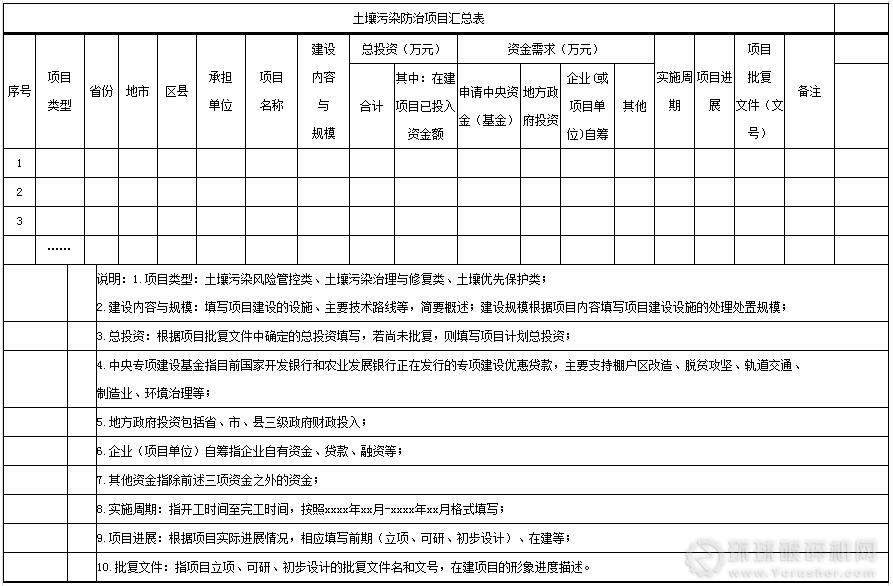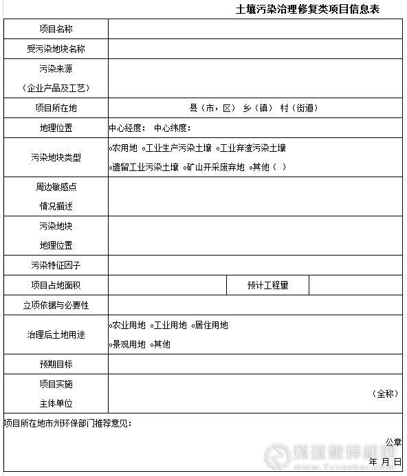 1、項目信息表,詳見附件1、2、3。土壤污染風險管控類項目信息按附件1填寫,土壤污染治理修復類項目信息按附件2填寫,土壤優先保護類項目按附件3填寫。