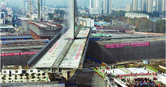 該立交橋轉(zhuǎn)體,刷新了三項(xiàng)世界紀(jì)錄:轉(zhuǎn)體橋體重達(dá)2.48萬(wàn)噸,迄今為止世界之最;轉(zhuǎn)體橋長(zhǎng)度238米,成為當(dāng)今世界采用單球鉸轉(zhuǎn)動(dòng)施工的最長(zhǎng)橋梁;4.5米的球鉸直徑也是目前工業(yè)鑄造領(lǐng)域的最大直徑。