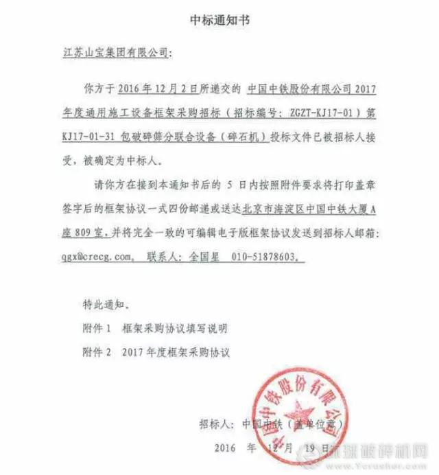 日前,江蘇山寶集團(tuán)中標(biāo)“中國中鐵股份有限公司2017年度通用施工設(shè)備框架采購招標(biāo)第KJ17-01-31包破碎篩分聯(lián)合設(shè)備(碎石機(jī))項(xiàng)目”,將與中國中鐵簽訂年度采購框架協(xié)議。
