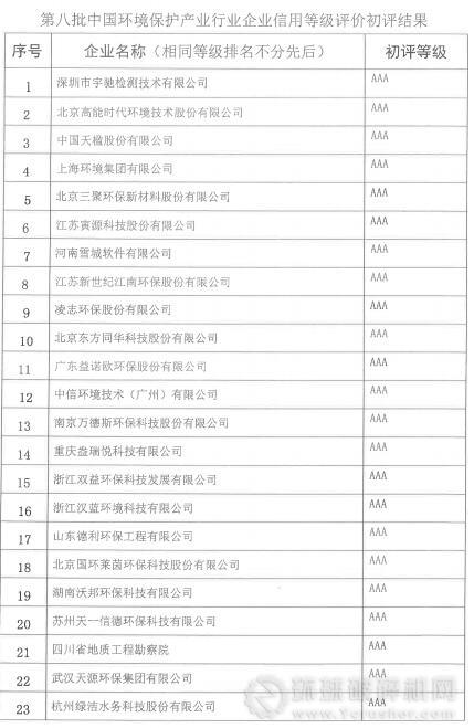 關于第八批中國環境保護產業行業企業信用等級評價初評結果公示的公告