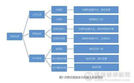 并購(gòu)主要存在上市公司、并購(gòu)標(biāo)的、中介機(jī)構(gòu)等幾個(gè)利益主體(圖1)。對(duì)于所有交易主體而言,雖然都希望交易成功,但因風(fēng)險(xiǎn)不同,每一方對(duì)交易成功的渴望也不同。一般來(lái)講,對(duì)交易成功的渴望度為 FA(95%)>中介機(jī)構(gòu) > 券商 >PE 小股東(70%)> 標(biāo)的方大股東(50%)> 上市公司> 監(jiān)管層。