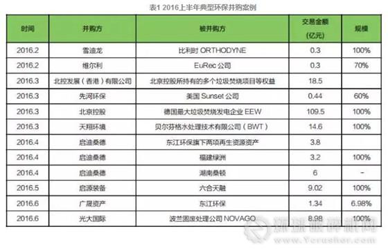 環(huán)保行業(yè),2016 年環(huán)保板塊外延動(dòng)力充足 , 并購(gòu)規(guī)模不斷提升,主要表現(xiàn)為:2016 上半年,環(huán)保板塊國(guó)內(nèi)并購(gòu) 24 起 , 金額 83.13 億元 , 單個(gè)項(xiàng)目3.46億元,較2015年的2.05億元、2014 年的 2.67 億元均有所提升;成立并購(gòu)基金18支,總規(guī)模301.1億元,單支規(guī)模 16.72 億元,同比提升 46%(東吳證券);并購(gòu)方通過(guò)收購(gòu)優(yōu)質(zhì)企業(yè),并表后大幅增厚公司業(yè)績(jī)、并不斷完善產(chǎn)業(yè)鏈跨越性發(fā)展。2016 年上半年,典型并購(gòu)案例見(jiàn)表 1。