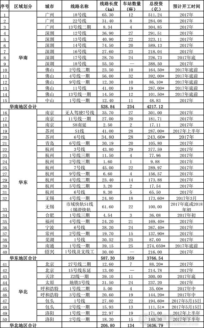 華南地區(qū)有廣州、深圳、佛山、中山4座城市,共新增15條新開工線路,合計里程為528.84公里,車站234座,投資額為4217.12億元;