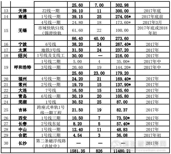 據(jù)不完全數(shù)據(jù)統(tǒng)計顯示,2017年,中國有北京、廣州、深圳、佛山、中山、南京、蘇州、青島、杭州、無錫、合肥、福州、寧波、常州、蕪湖、南通、紹興、天津、太原、呼和浩特、包頭、洛陽、重慶、成都、長沙、鄭州、長春、大連、吉林、西安30座城市軌道交通新增63條即將開工線路,合計里程為1581.35公里,車站826座,總投資額為11480.21億元。