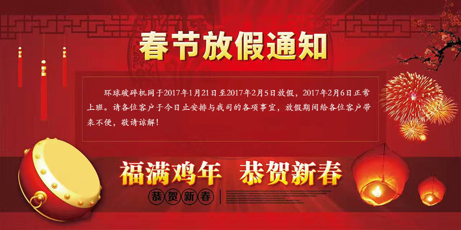 春節(jié)假期馬上開始了,環(huán)球破碎機(jī)網(wǎng)放假安排如下:2017年1月21日至2017年2月5日放假,2017年2月6日正常上班。請各位客戶于今日止安排與我司的各項(xiàng)事宜,放假期間給各位客戶帶來不便,敬請諒解!