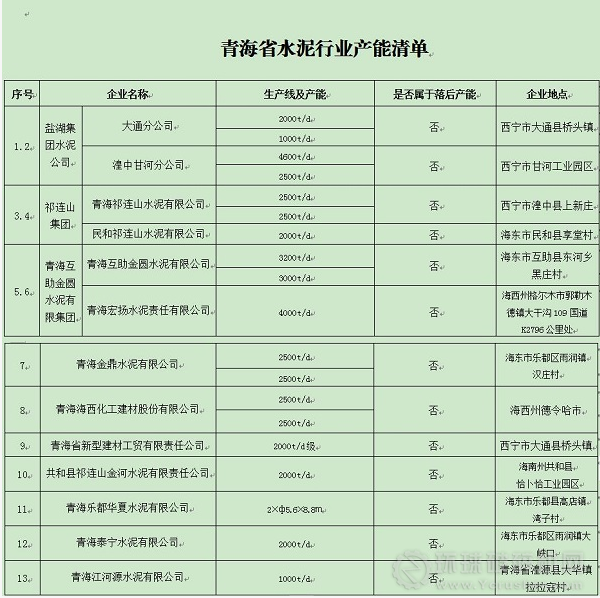 青海省經信委發布了水泥行業產能清單,共涉及13家水泥企業,分別是:鹽湖集團水泥公司、祁連山集團、青海互助金圓水泥有限公司、青海金鼎水泥有限公司等。