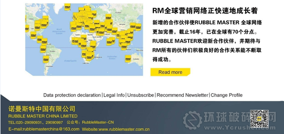 新增的合作伙伴使RUBBLE MASTER 全球網(wǎng)絡(luò)更加完善,截止16年,已在全球有70個(gè)分點(diǎn)。RUBBLE MASTER歡迎新合作伙伴,并期待與RM所有的伙伴們積極良好的合作關(guān)系能不斷取得成功。