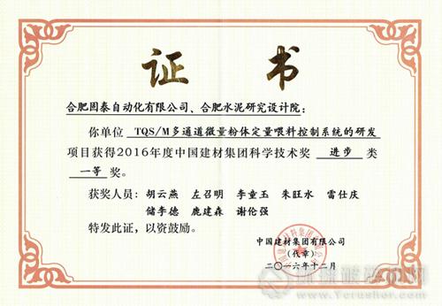 近日,合肥水泥研究設計院收到由中國建筑材料集團有限公司頒發的2016年度科學技術獎的獎狀證書。合肥固泰自動化有限公司自主研發的“TQS/M多通道微量粉體定量喂料控制系統”項目喜獲中國建筑材料集團科學技術獎進步類一等獎。