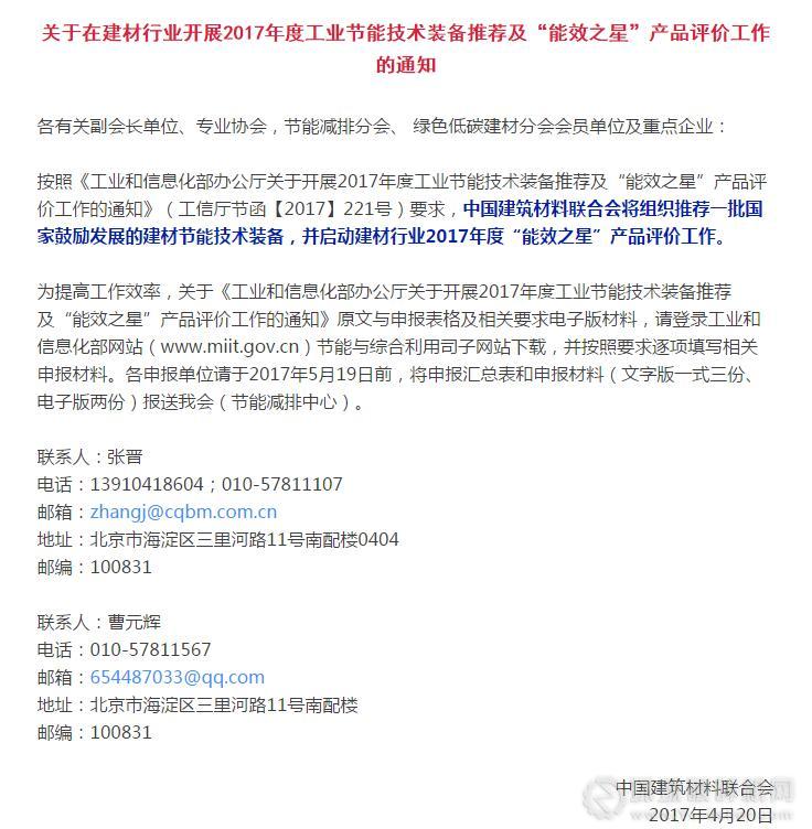 按照《工業和信息化部辦公廳關于開展2017年度工業節能技術裝備推薦及“能效之星”產品評價工作的通知》(工信廳節函【2017】221號)要求,中國建筑材料聯合會將組織推薦一批國家鼓勵發展的建材節能技術裝備,并啟動建材行業2017年度“能效之星”產品評價工作。感興趣的砂石骨料企業可報名參與。